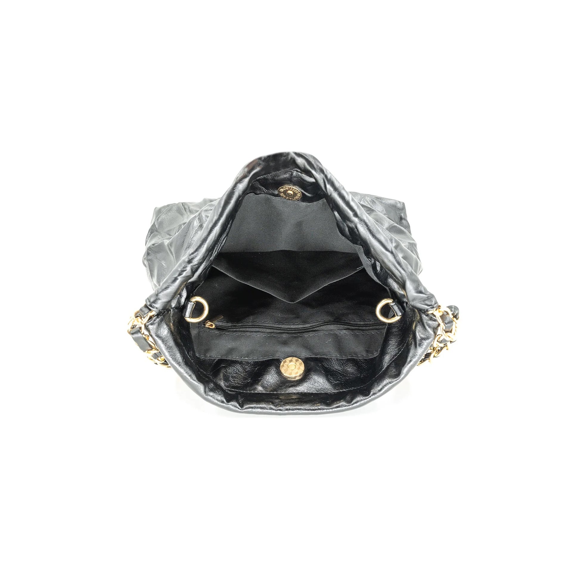 This chic bag features a crinkle look and gold chain.