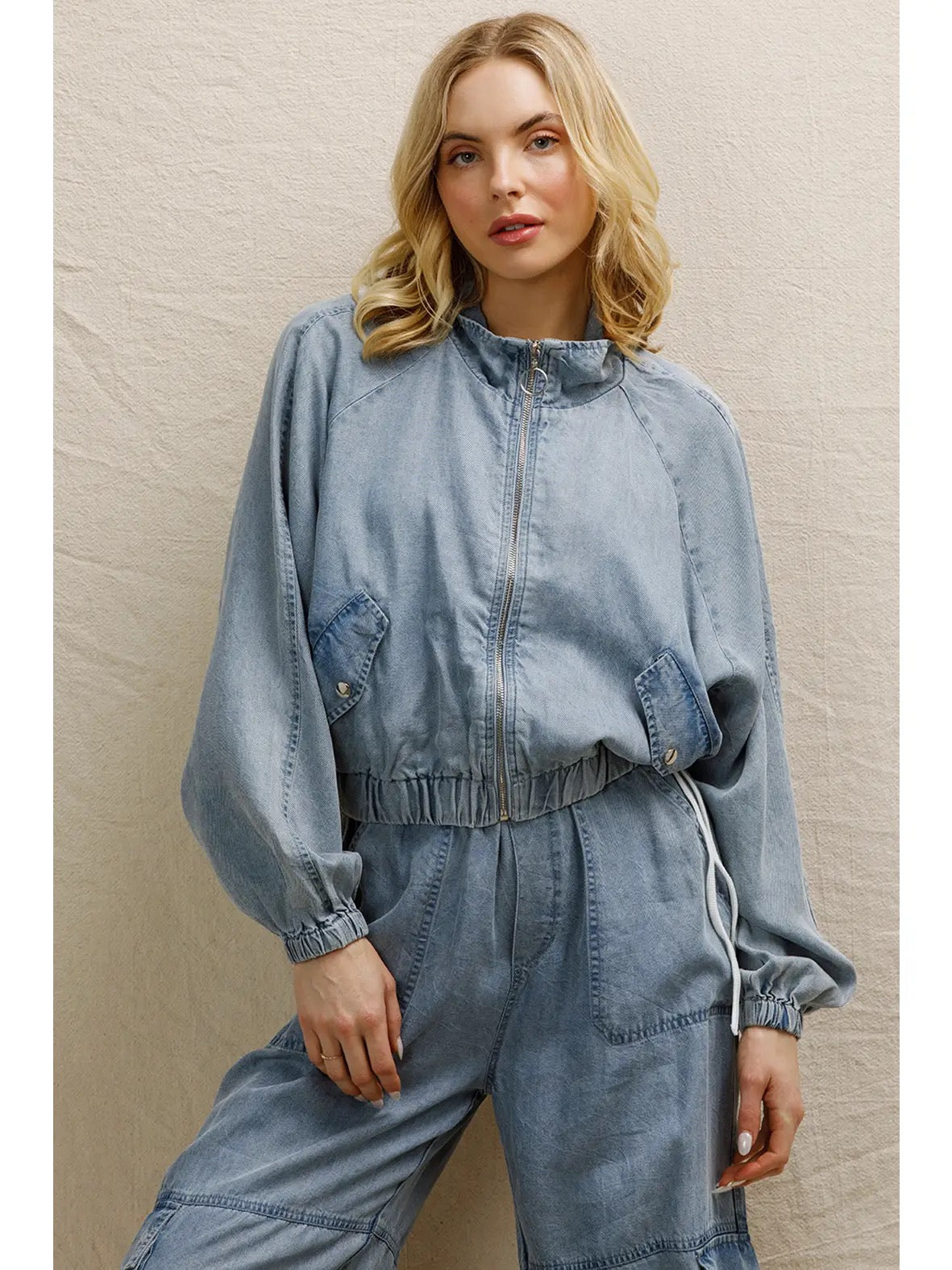 Ready for anything in this adorable bomber jacket. Featuring a zipper closure to a mock neck top, two front pockets and a cropped elastic waistband and sleeves.