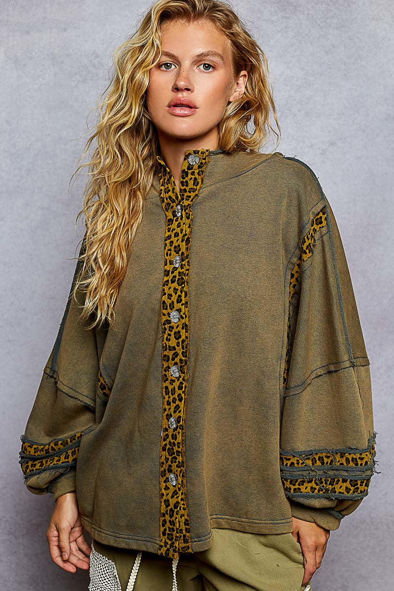 Designed in balloon sleeve roomy fit hoodie jacket top in French terry with animal print patch, metal floral buttons, outseam, vintage washing, solid color.