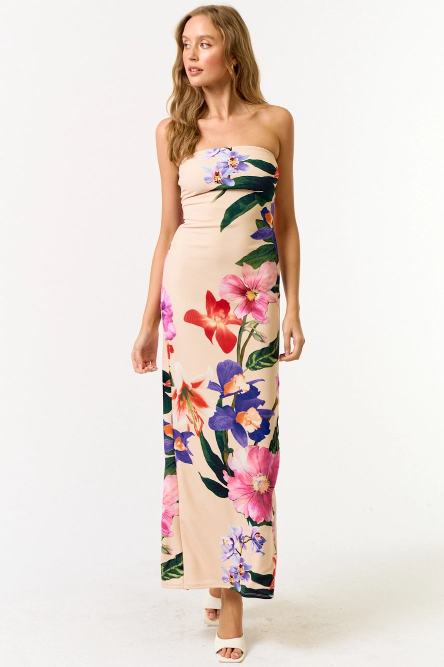 Be the prettiest in the room with this dress! An elegant strapless Tube maxi in a beautiful floral print. It is a stretchy material that is as comfortable as ever! Dress up for a wedding, or down for date night. Fully lined.