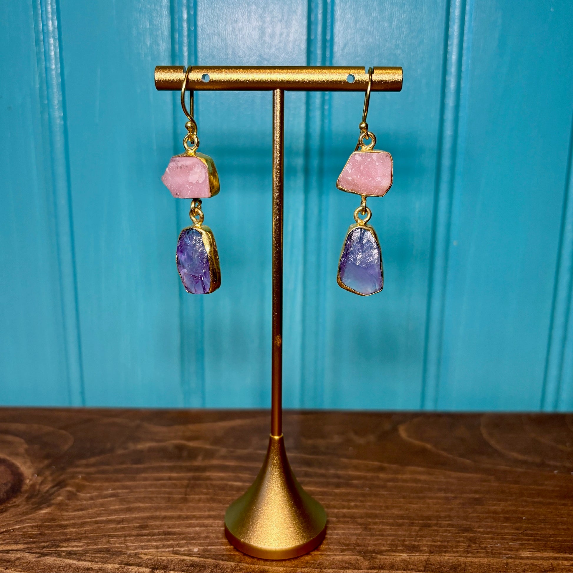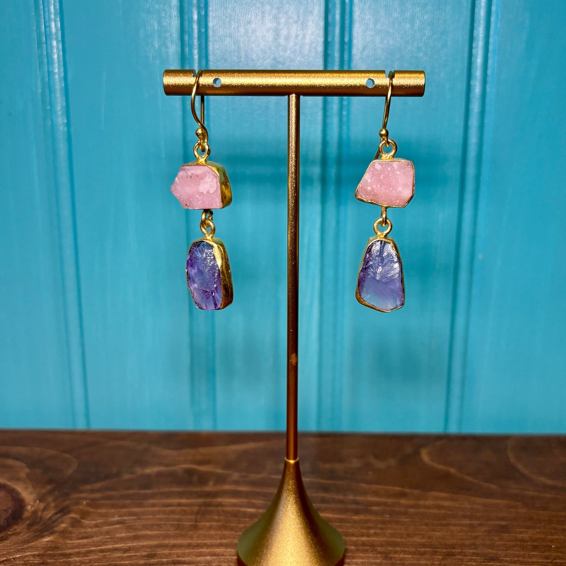 Rose quartz and amethyst stones in gold filled earring setting with fishhook backs.