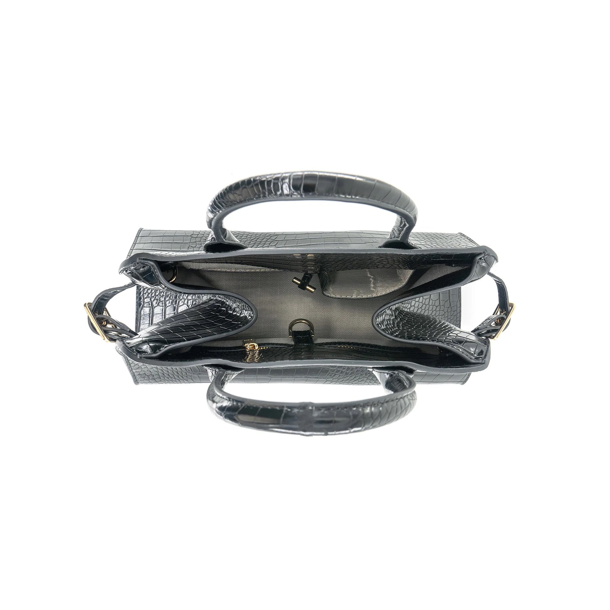 This handbag is made of high-quality, faux leather with a crocodile print. It's the perfect size. There is gold sturdy hardware throughout that adds to its durability and stylish appeal. There is a hook and eye closure, interior pockets and a detachable strap.